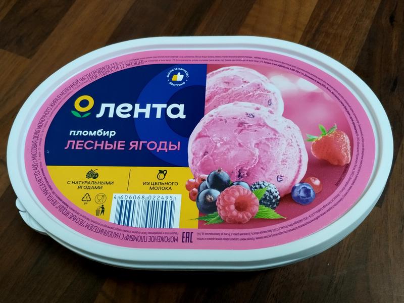 Вчера вместо ужина у нас было мороженое, которое мы купили в супермаркете "Лента". Взяли три пломбира в пластиковых ванночках с разными вкусами. Все три мне понравились, но больше всего меня порадовал пломбир с наполнителем "лесные ягоды" под брендом самого магазина. Пломбир "Лента" продаётся в небольшой овальной формы ванночке с яркой этикеткой. Мороженого в ней 400 грамм. Изготовлен пломбир из цельного молока с добавлением натуральных ягод (малины, ежевики, клубники, черники, чёрной и красной смородины). Цвет мороженого бледно-розовый с вкраплением измельчённой ягоды. Жирность для пломбира минимальная 13%. Растительных жиров в составе нет. Вкус мороженого сливочно-ягодный, насыщенный, но не химозный. Понравилось, что есть приятная кислинка, делающая вкус более интересным. Сахара немного, что тоже здорово (не люблю когда приторно). В общем, вкус, состав, упаковка - всё на 5 баллов. Да и цена 150 рублей за ванночку тоже радует.