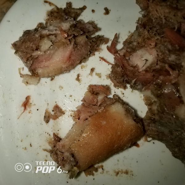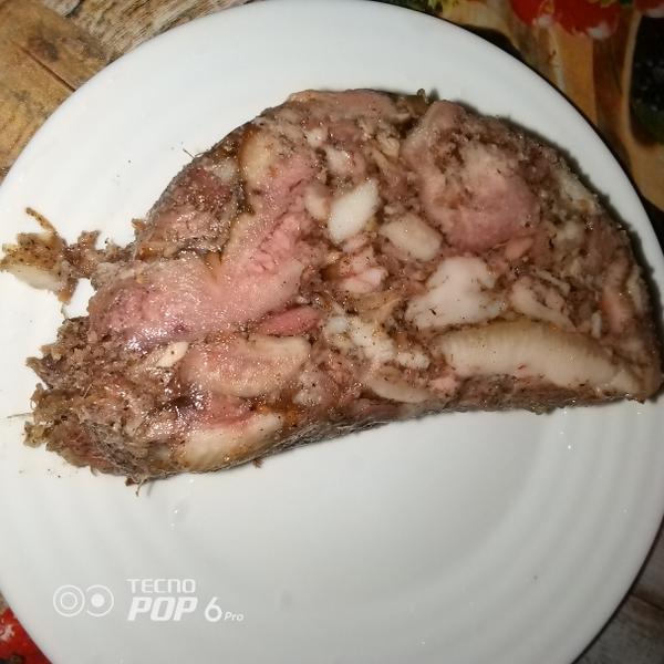 Когда немного растеребанила эту смесь из свиных голов, нашла кусочки жира, свиных шкурок и мяса.