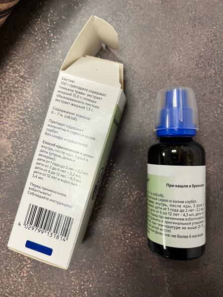 Отзыв: Сироп очень хорошо помог сыну 7 лет. Простыл в школе и начался затяжной булькающий кашель. Но откашливаться не получалось, из-за этого были навязчивые ночные приступы. По рекомендациям купила Бронхипрет в сиропе. Препарат очень хорошо формирует мокроту и позволяет выйти всей бяке, которая скопилась. Очень хороший натуральный состав - из плюща и тимьяна. И на вкус приятный.