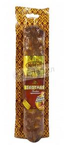 Так захотелось любимой сырокопчёной "Свиной" колбаски, что специально за ней выбежала в магазин. Но "Свиной" в нём не оказалось. Так как я уже настроилась поесть сырокопчёнки решила не уходить с пустыми руками. Из всего ассортимента меня больше всего привлекла колбаса под названием "Охотная". Во-первых, производитель Микоян. Во-вторых, колбаса с крупным жирком. В-третьих, в составе кроме свинины и шпика никого мяса нет. Батончик весом 300 грамм. Взяла на пробу.